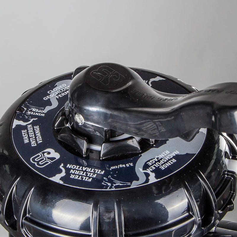 - Mischventil mit 6 Stellungen: Filtern, Geschlossen, Rückspülen, Zirkulieren, Entleeren und Nachspülen.